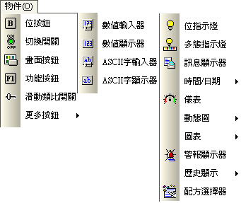 - 提供滑動類比開關、配方選擇器、多態按鈕(清單、下拉式清單)、單選按鈕...。