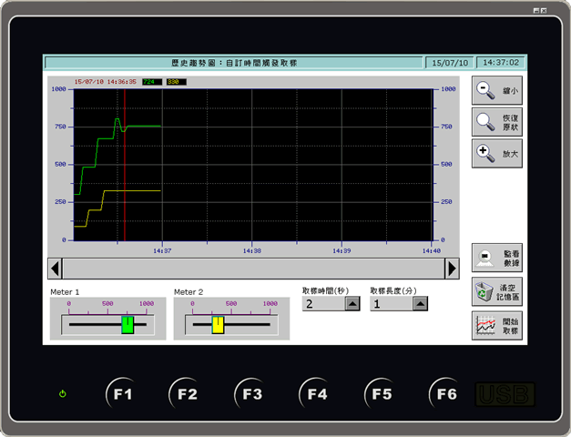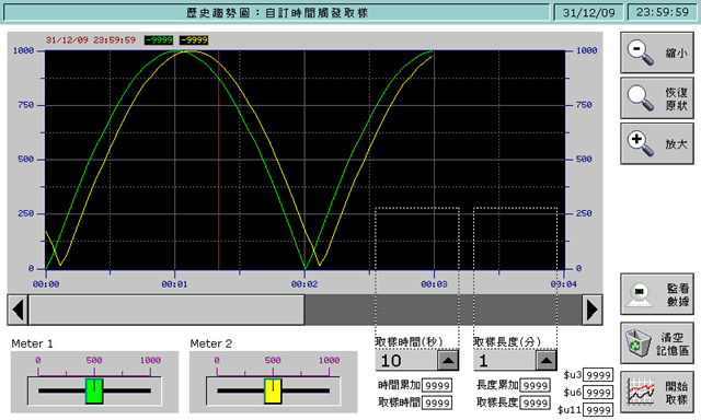 1. 支援計時、觸發、整點取樣。 2. 一個趨勢圖提供16條曲線。 3. 支援時間軸縮小/放大功能。 4. 提供 USB 存檔功能。