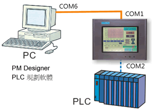 穿透通訊功能就是當PLC與觸控屏通訊的同時,電腦可以透過與觸控屏連接的傳輸線來執行PLC程式之上/下載、程式修改、程式監視...等功能。