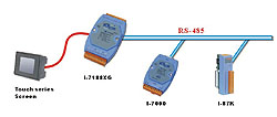 (RS485) 連接ICP DAS 的 I-7000 和 I-87xx 系列遠程I/O模組。對與需要分散式遠程模組的系統此種配置是十分有用的。 |