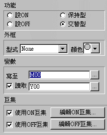 | 接點按鈕開關 | 設ON/OFF按鈕,保持型按鈕,交替型按鈕,有延遲及再確認的功能,並提供巨集指令 |