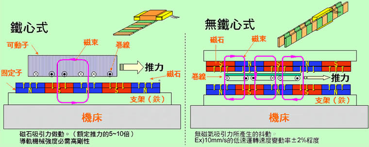 構造 •馬達為可動子(馬達線圈)及固定子(永久磁石 + 安裝板)的架構組成。 •可動子為積層鐵心馬達線圈上基板上的正確 位置定位結構。 •固定子為凹狀安裝板,永久磁石對稱固定於 位置定位結構。 特長 •無磁氣的吸引力不穩定力的速度抖動小。 •因無吸引,固導軌的壽命較長。 LM-T系列 規格 |