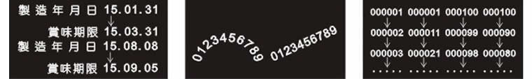 現在日期,有效日期印字 傾斜印字、扇形印字 計數印字 |