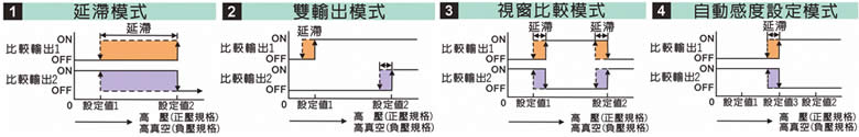 4 種模式:提供延滯模式,雙輸出模式,視窗比輸模式,自動感度設定模式 (可通過按鈕操作選擇) |
