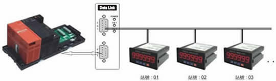 | 範例三: | 三菱 PLC(A1SJ71UC24-R2 / QJ71C24)/GE PLC(CMM311),透過資料交換器與盤面式儀錶連線,不需要撰寫任何通訊程式,竟而達到讀取 / 設定儀錶資料。 | |||||