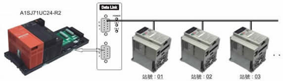| 範例二: | 三菱 PLC,A1SJ71UC24-R2/QJ71C24,透過資料交換器與三菱變頻器通訊埠連線,不需要撰寫任何通訊程式,竟而達到控制變頻器的頻率及顯示輸出頻率。 | |