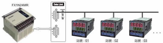 | 範例一: | 三菱PLC (Q、A、FX系列),透過資料交換器與溫度控制器連線,不需要撰寫任何通訊程式,竟而達到控制溫度表的設定值及顯示現在值( PID功能,Relay輸出,SSR輸出,類比輸出,全部交給溫度表做控制 )。 | |||||