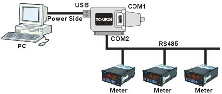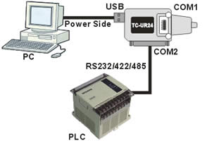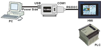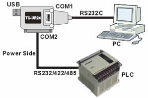 c. COM1(PC/RS232) to COM2 (RS232/422/485) PLC.     d. PC (USB) to COM2 (RS485) devices.