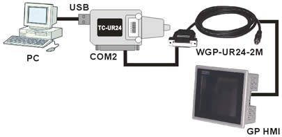 a. PC (USB) to COM2 (RS232/422/485).            b. PC (USB) to standard serial port COM1 (RS232C).